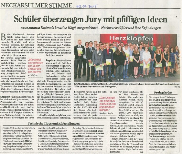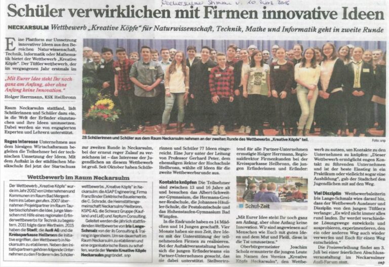 Beim Wettbewerb „Kreative Köpfe“ haben junge Menschen aus dem Raum Neckarsulm zum dritten Mal ihren Einfalls- und Ideenreichtum unter Beweis gestellt. 31 Schüler im Alter von 13 bis 16 Jahren verwirklichten in enger Kooperation mit den unterstützenden Unternehmen 13 innovative Ideen, die von den Juroren ausgewählt wurden.